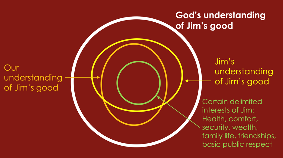Next, we recognize that even after we counsel Jim we might not agree entirely with Jim’s understanding of his own good. We might think that Jim is too careerist for his own good, or too vain, or too decadent. We might think Jim is too complacent. Let’s add our understanding of Jim’s whole good: