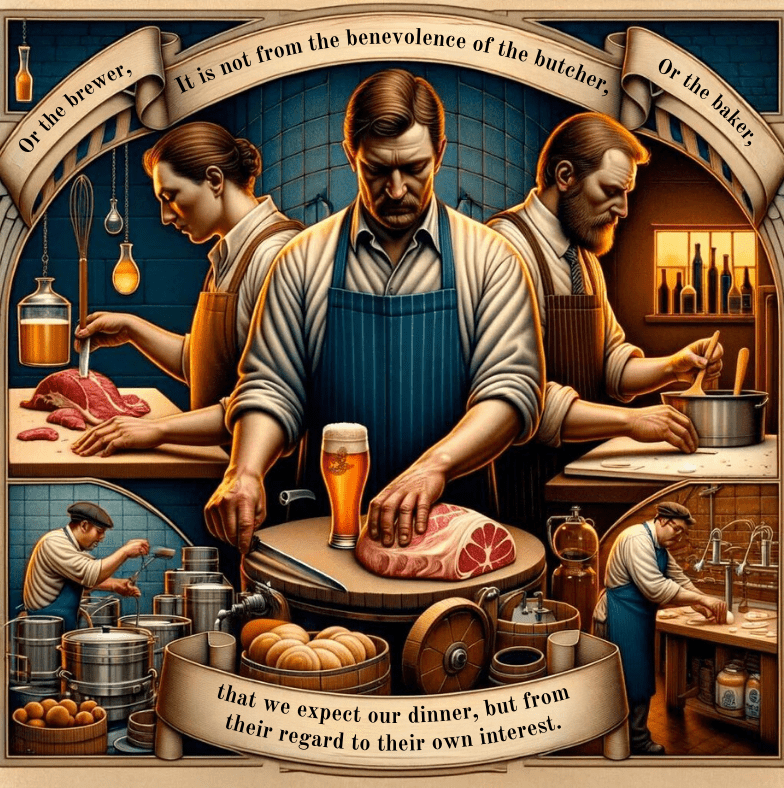 It is not from the benevolence of the butcher, the brewer, or the baker that we expect our dinner, but from their regard to their own interest. We address ourselves, not to their humanity but to their self-love, and never talk to them of our own necessities but of their advantages.