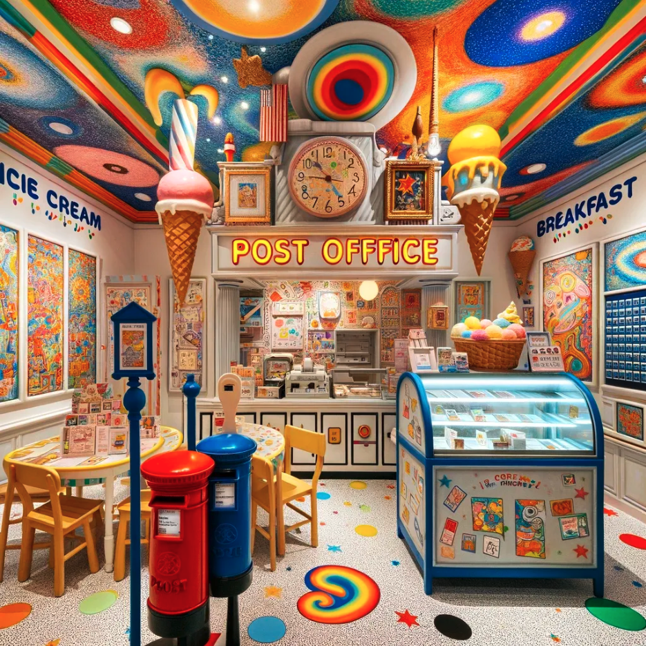 Before I could scoff and interrogate the idea that any Post Office would have ice cream, breakfast, or pictures, I realized she would learn that dreary fact someday.