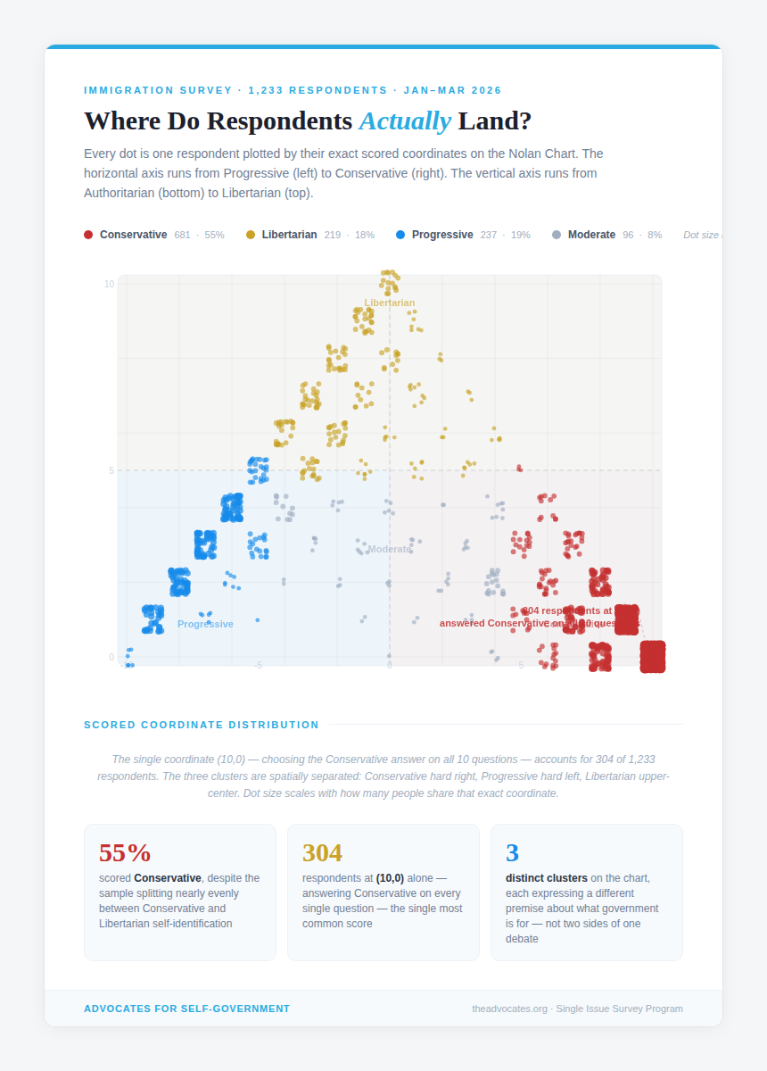 Advocates for Self-Government collected responses between January 14 and March 8, 2026, with 1,233 unique respondents. Each respondent answered 10 questions about current immigration enforcement topics, ranging from sanctuary cities to the use of force by federal agents. Based on their answers, we scored and plotted respondents on a Nolan-style chart.