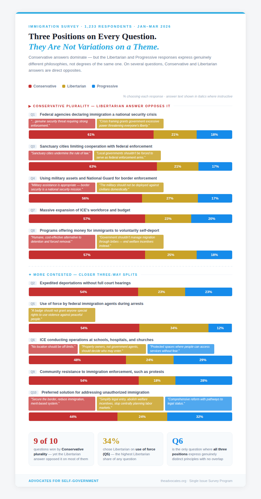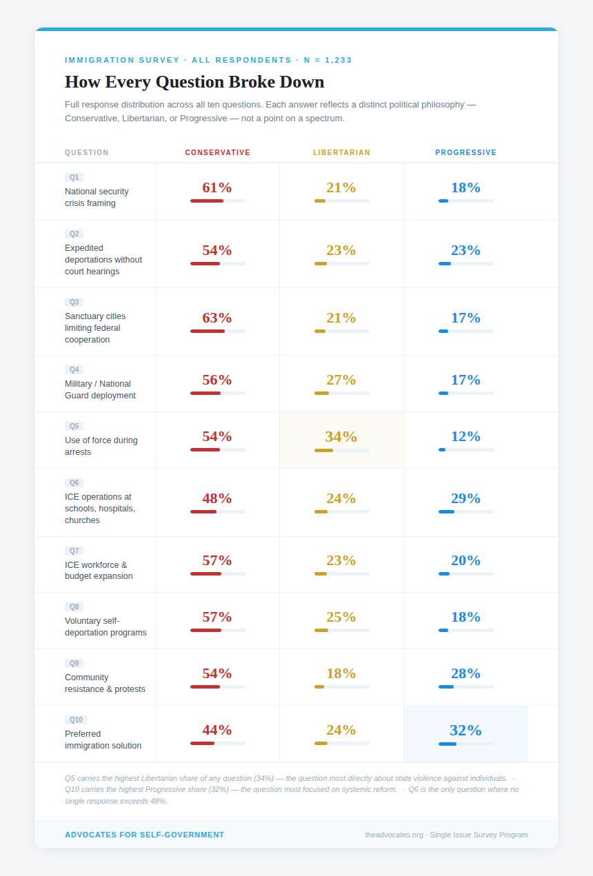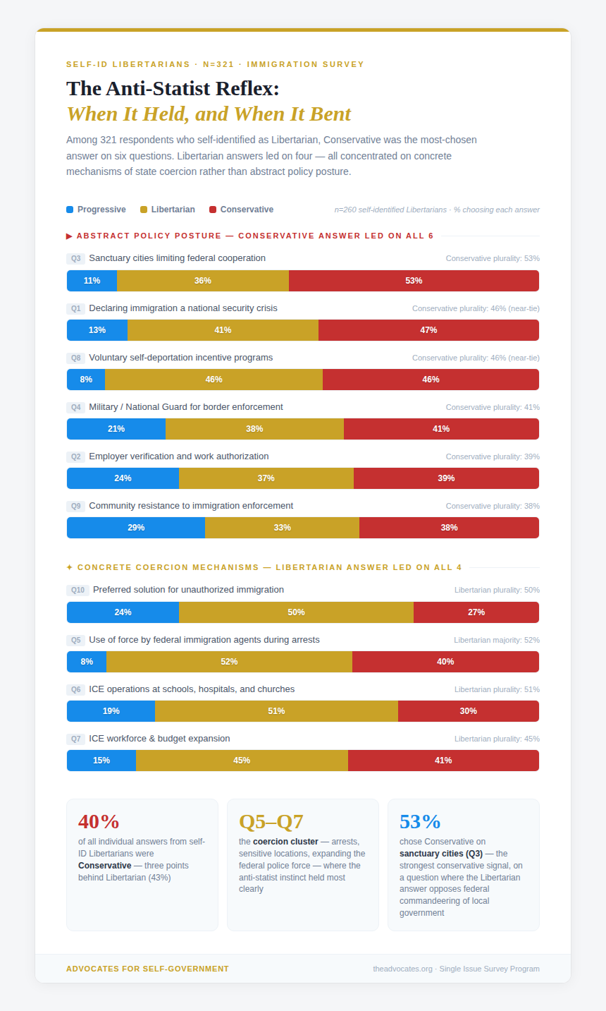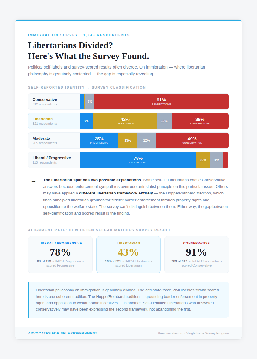 That division matters for reading the results honestly. The near-equal Conservative/Libertarian answer split among self-ID Libertarians may reflect genuine philosophical disagreement within libertarianism as much as it reflects enforcement sympathies overriding principle. The survey can't distinguish between someone who chose the Conservative answer because they wanted strong enforcement and someone who chose it because a different libertarian framework pointed them there.