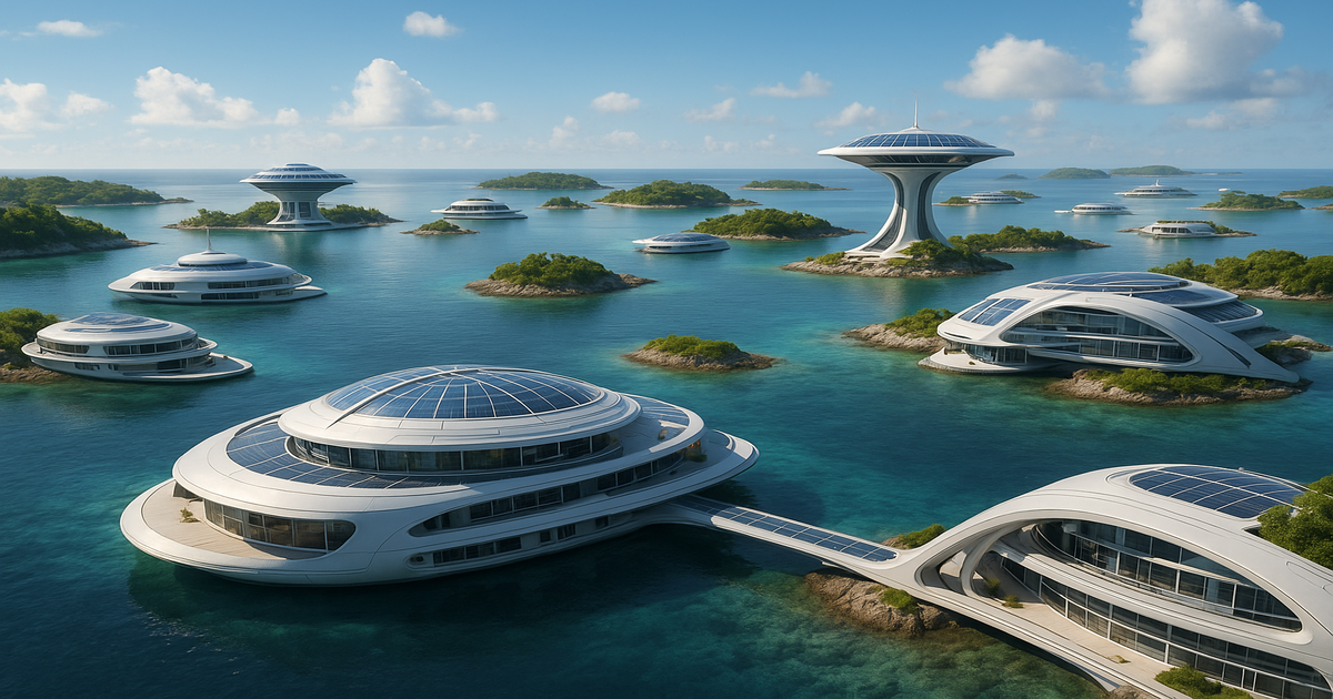 - An archipelago of gleaming, high-tech cities built on artificial islands in calm blue oceans…